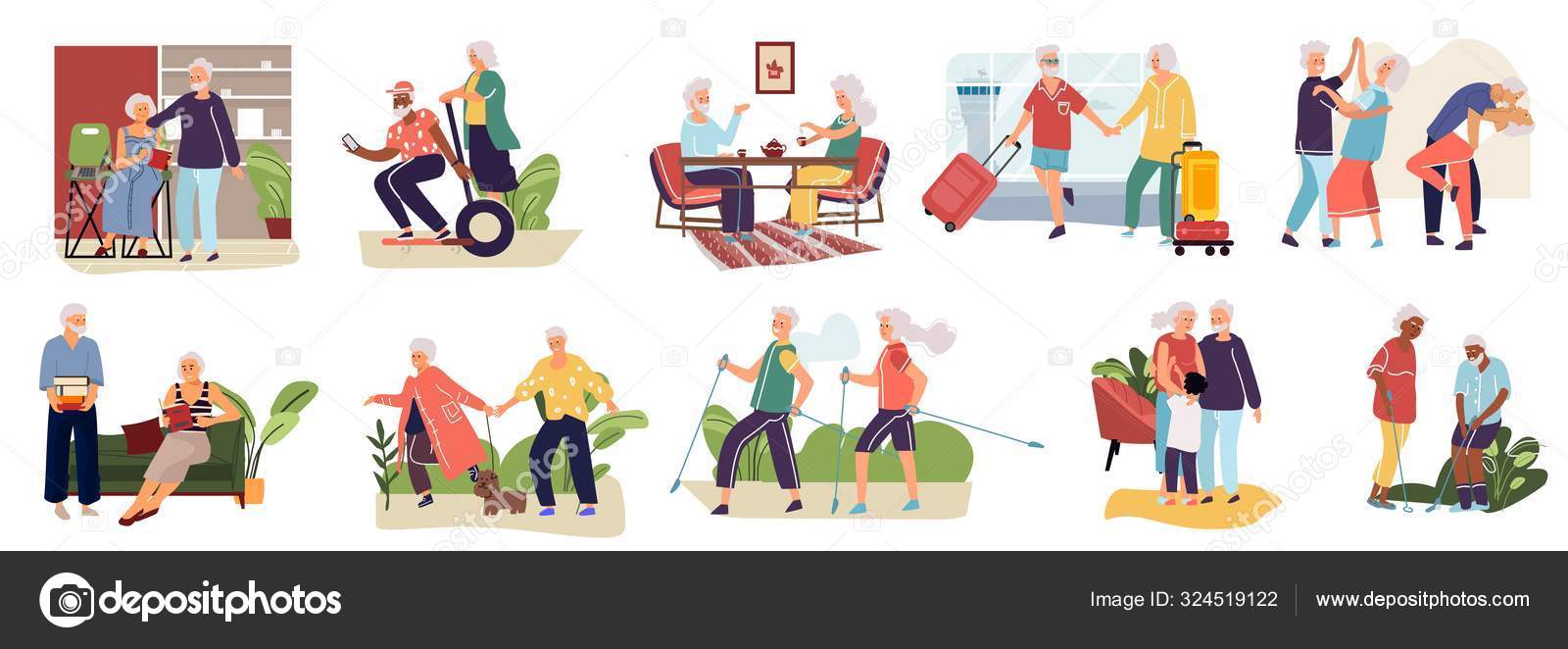 Pasangan Lansia Kartun Tangan Digambar Karakter Lama Menghabiskan Waktu Bersama Sama Belanja Beristirahat Di Kafe Membuat Latihan Set Vektor Stok Vektor C Spicytruffel 324519122
